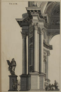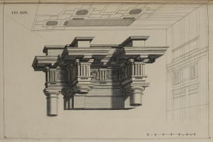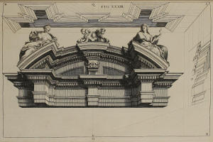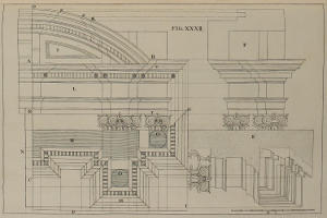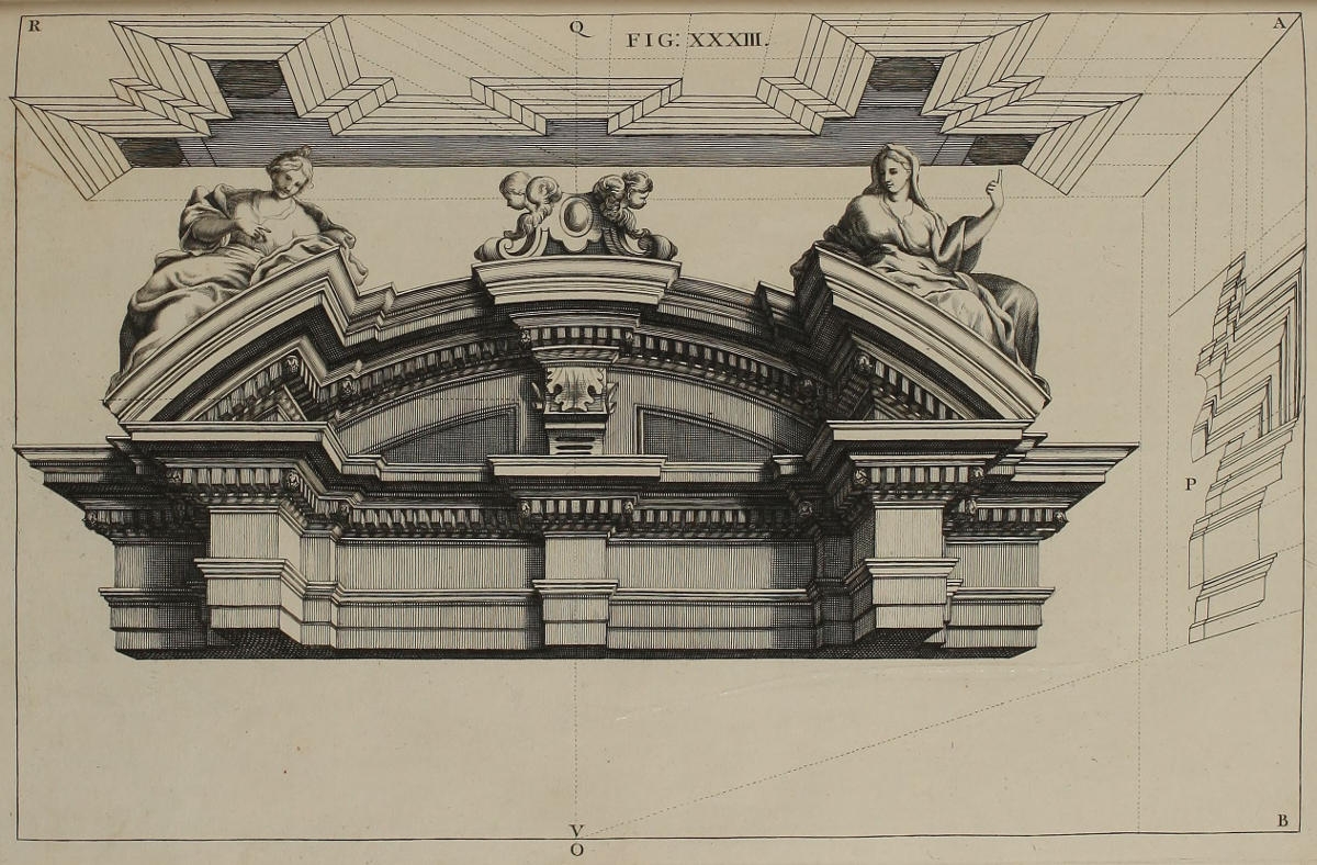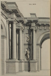 Optica projectio ædificii Ionici; ubi de modo jungendi fictum cum vero, | XXX. | An Ionick Work in Perspective, with the Manner of reconciling the fictitious to the solid Architecture. |