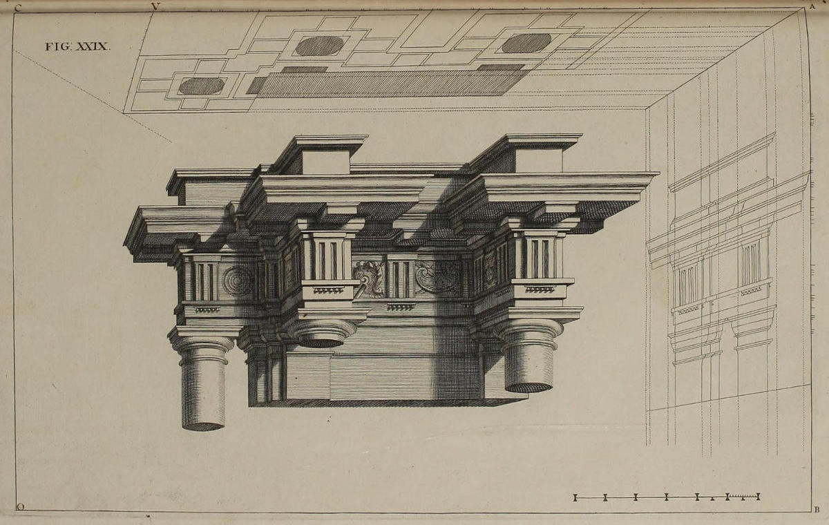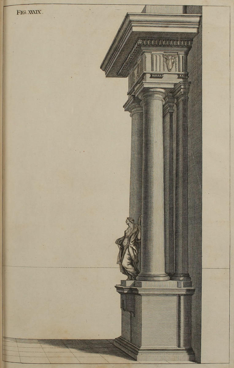 Optica projectio ædificii Dorici, | XXIX. | A Projection of the Dorick Order in Perspective. |