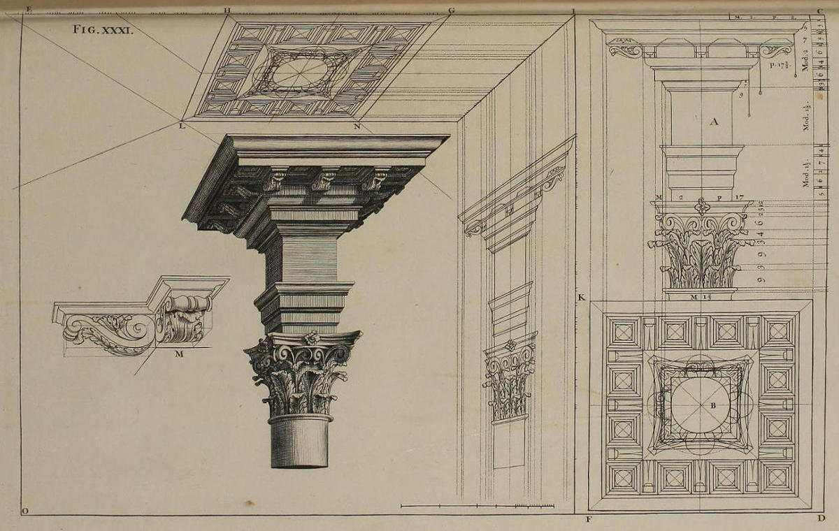 Optica projectio coronicis Corinthiæ, cum capitello & summitate columnæ, | XXXI. | The Optick Projection of a Corinthian Cornice, with the Capital and part of the Column. |