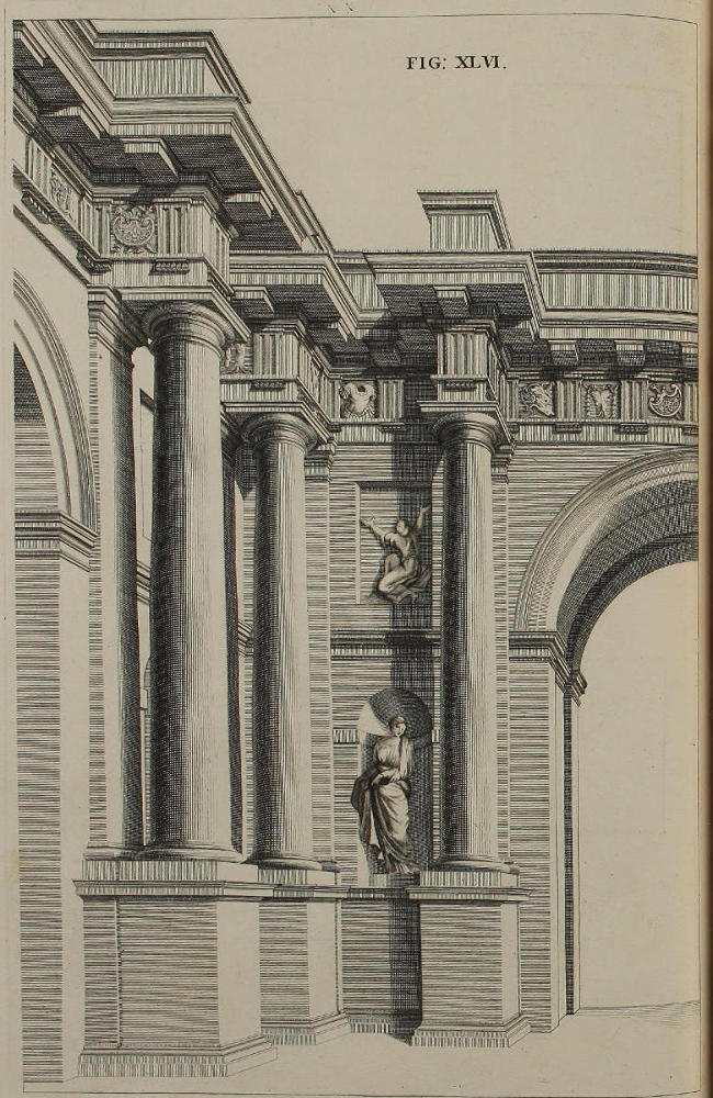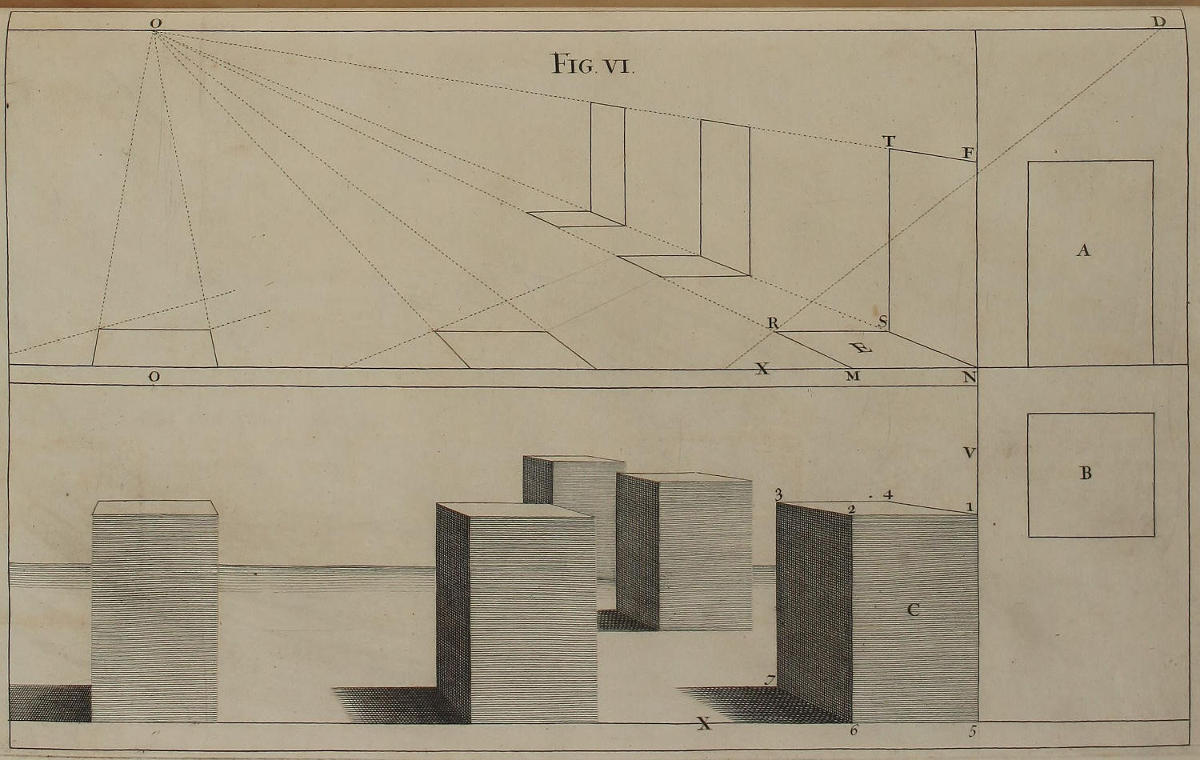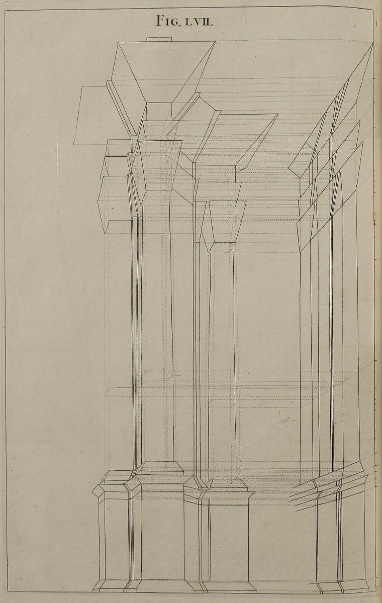 Concinnitatem ac symmetriam opticæ delineationes ædificiorum habere nequeunt, nisi utramque mutuentur ab Architectura. Proinde necesse est, ut in istius graphide ac intelligentia te aliquandiu exerceas, donec uniuscujusque elevationis vestigium formare didiceris, ex eoque eruere sectionem totius longitudinis, ut in Opere toto videre est, præsertim figuris sexagesimaoctava & septuagesima. Siquidem ex vestigio & ex sectione derivatur in opticas imagines congrua rerum singularum profunditas.