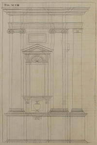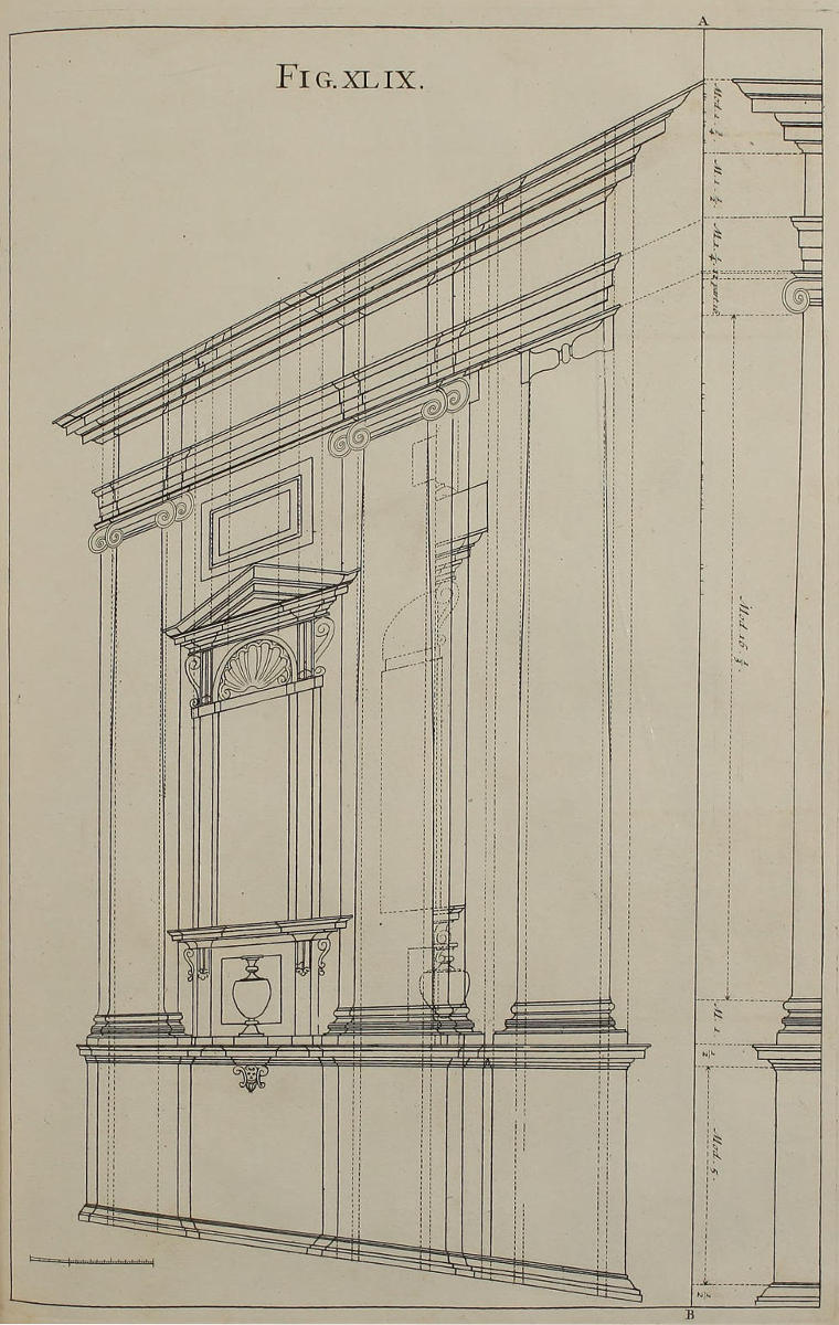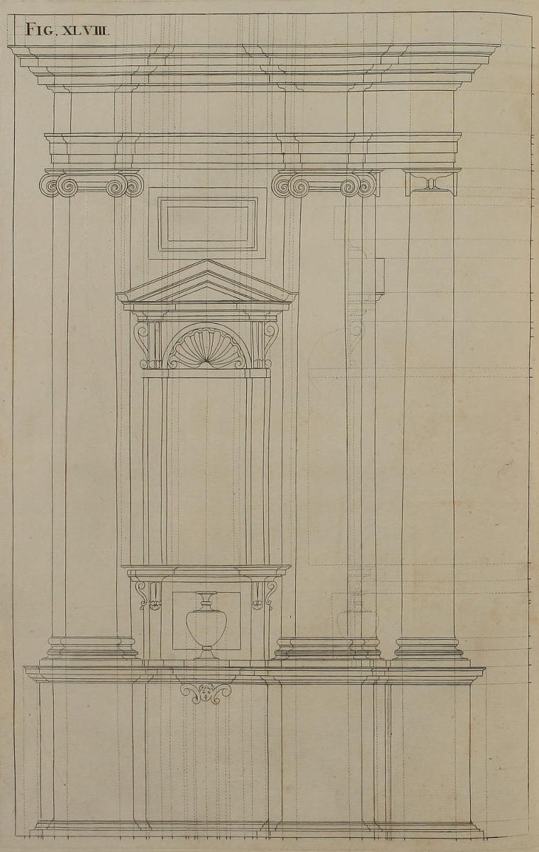 Elevatio geometrica ædificii Ionici, | XLVIII. | Geometrical Upright of the foregoing Ionick Design. |
