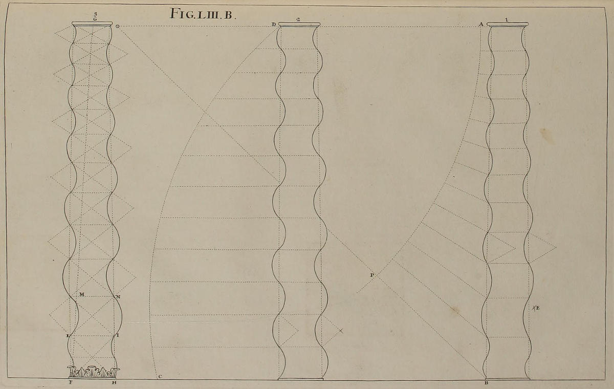 Modus triplex delineandi columnas spirales, | LIII. B. | Three different ways of delineating wreath’d Columns. |