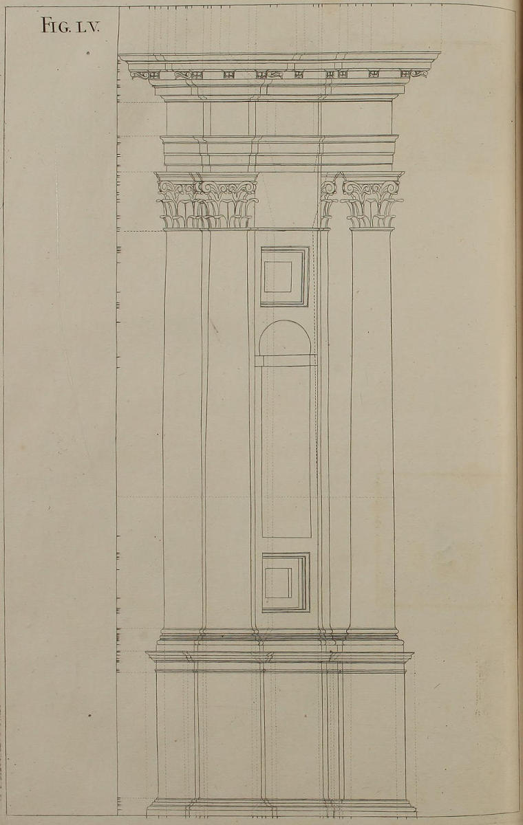 Elevatio ædificii Ordinis Corinthii, | LV. | The Geometrical Elevation of a Corinthian Work. |