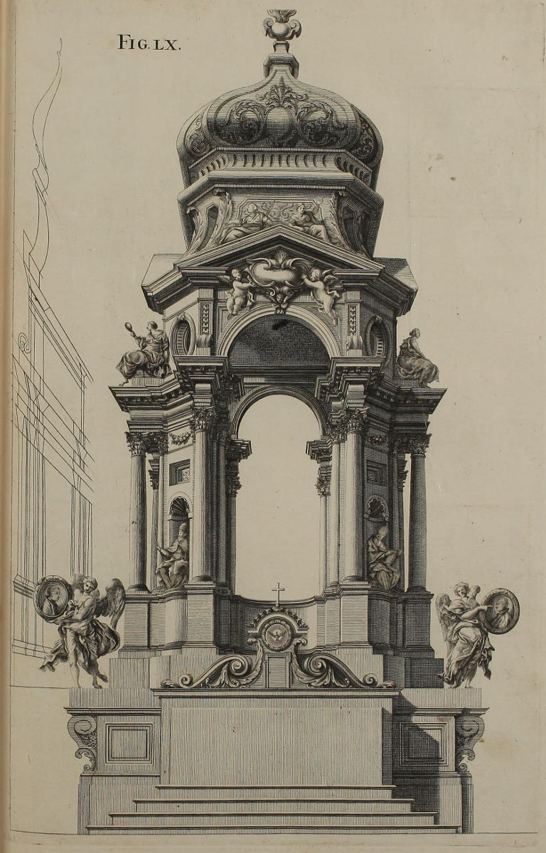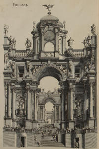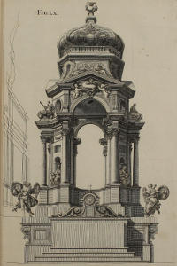 Theatrum repræsentans nuptias Canæ Galilææ, constructum Romæ anno 1685, in expositione Ven. Sacramenti, in templo Farnesiano Societatis Jesu, | LXXI. | A Theater representing the Marriage of Cana in Galilee, erected in the Jesuits Church at Rome, 1685, for the Solemnity of exposing the Holy Sacrament. |