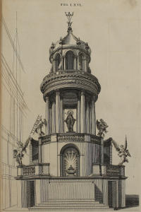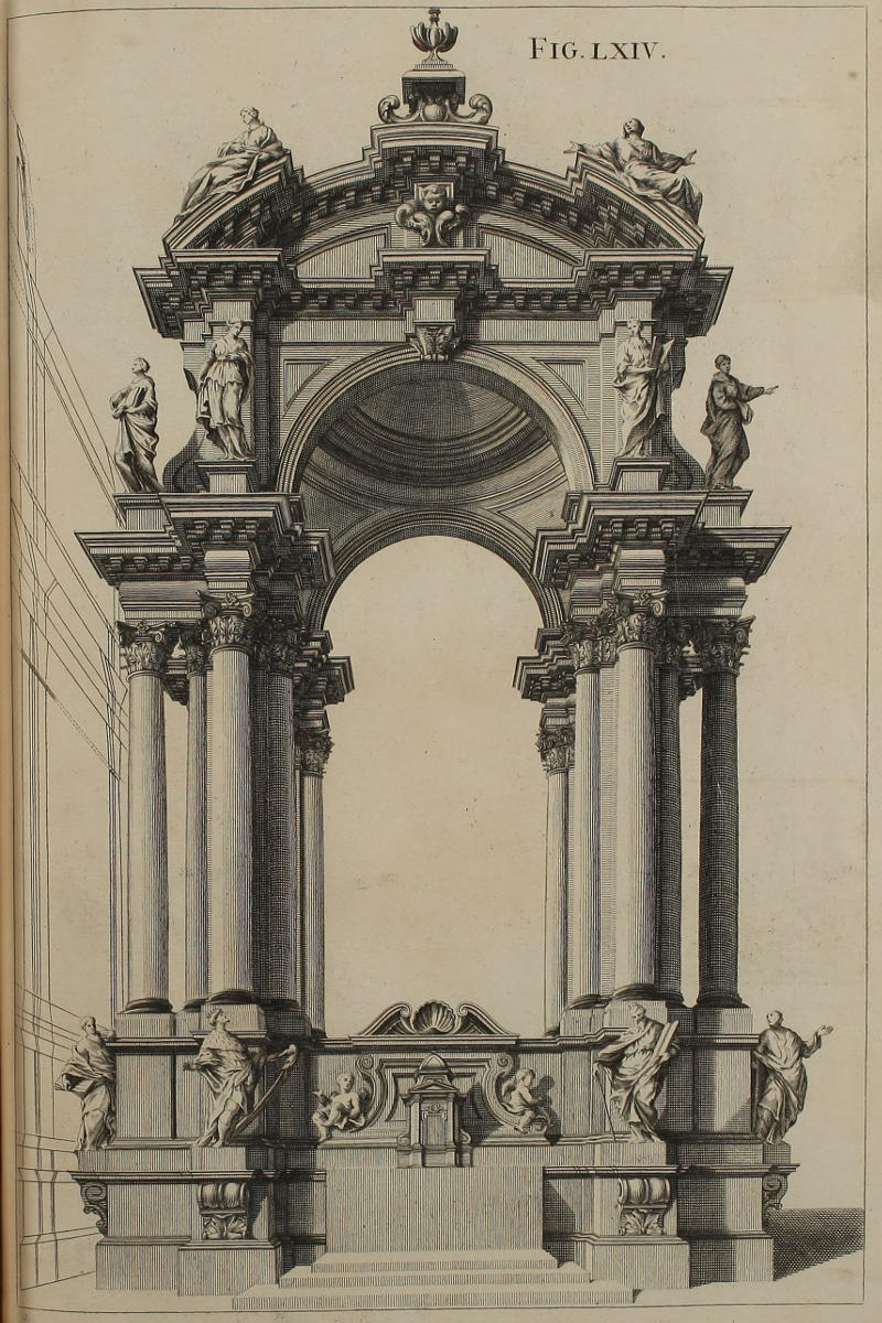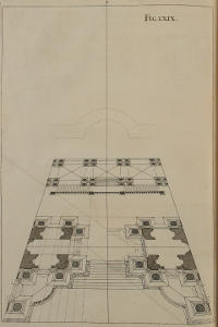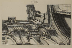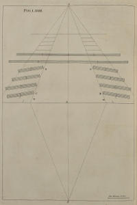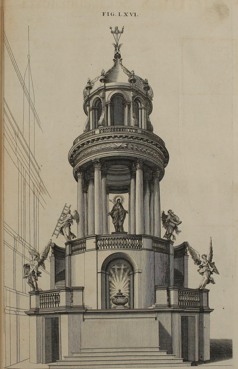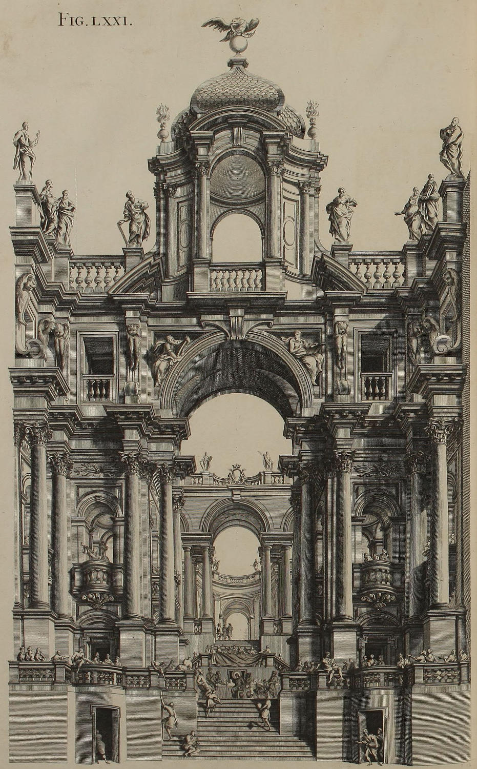 The Manner of Designing, where the Perspective is drawn on several Ranges of Frames one behind the other, and such Scenes of Theaters whose Grooves lie oblique to the middle Line, is also here laid down: And by our Author’s Method, Horizontal Perspective, or that of Ceilings, is render’d less difficult than the Vertical, or that against an upright Wall. Upon the whole, nothing seems wanting that may make a Work of this nature complete; unless what concerns Designs which are either Circular, or abound with many Columns: For the Performance whereof, the Author, as he promises in the Sixty-fifth Figure, has, in a SECOND Volume, given a Rule more proper for the purpose; which also may possibly be made English in due time, if this Part meet with Encouragement.