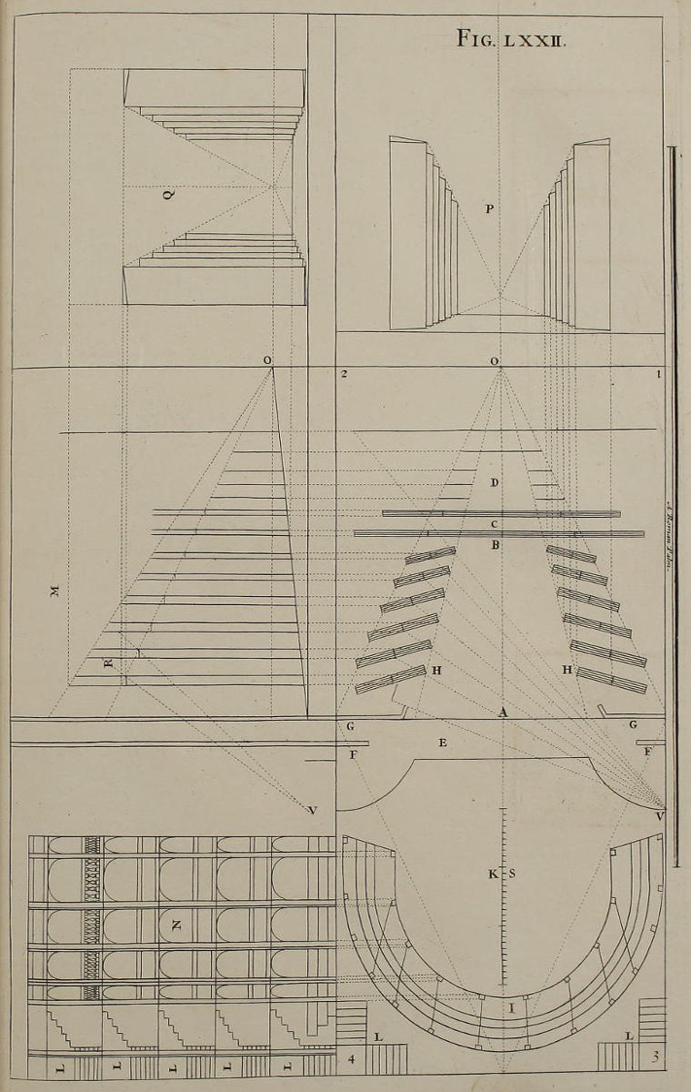 Aliud vestigium theatri; ubi de modo inveniendi ejus punctum, | LXXIII. | Another Plan of a Theater, with the Method of finding the Point of Sight therein. |