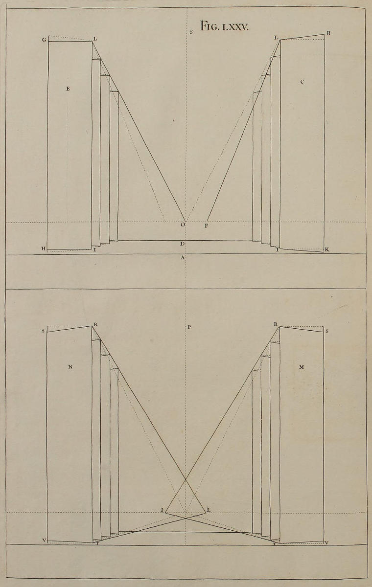 Elevatio scenarum coram inspectarum; ubi docetur artificium, ut scenæ obliquæ appareant rectæ, | LXXV. | The Elevation of Scenes in Front, and how the oblique Scenes are made to appear direct. |