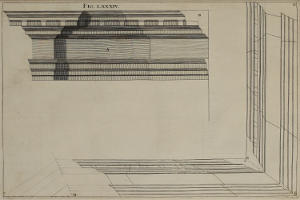Coronix Corinthia horizontaliter contracta, | LXXXV. | A Corinthian Cornice in horizontal Perspective. |