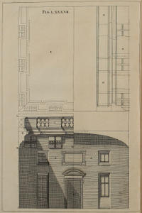 IV. That you would accustom yourself in Works that have many Lines, to make the Perspective-Plans and Uprights for each Part distinct, so as to prevent all Danger of Confusion. Thus you may have one Plan and Upright for the Basement of a Building; and when that is drawn on your finish’d Piece, remove them, and place those of the Body of the House; and when that’s complete, do so by the Attick, &c. always observing so to place the Plan below, and the Upright on one side of your neat Draught, that your Drawing-Square may command each of them; which will mightily shorten your Work.