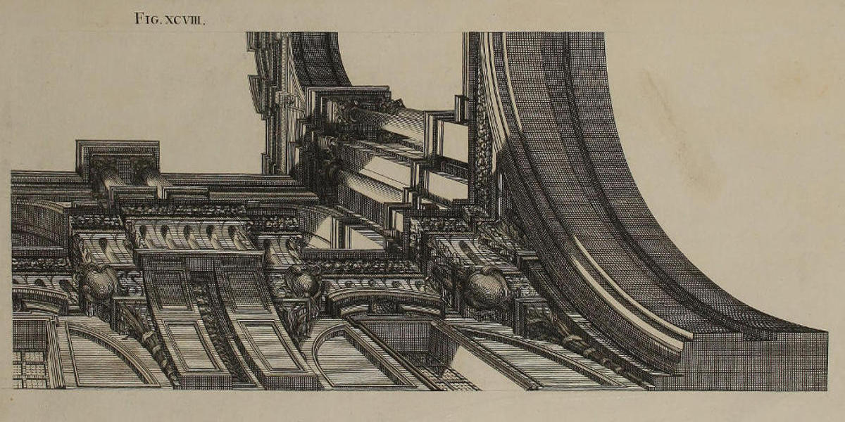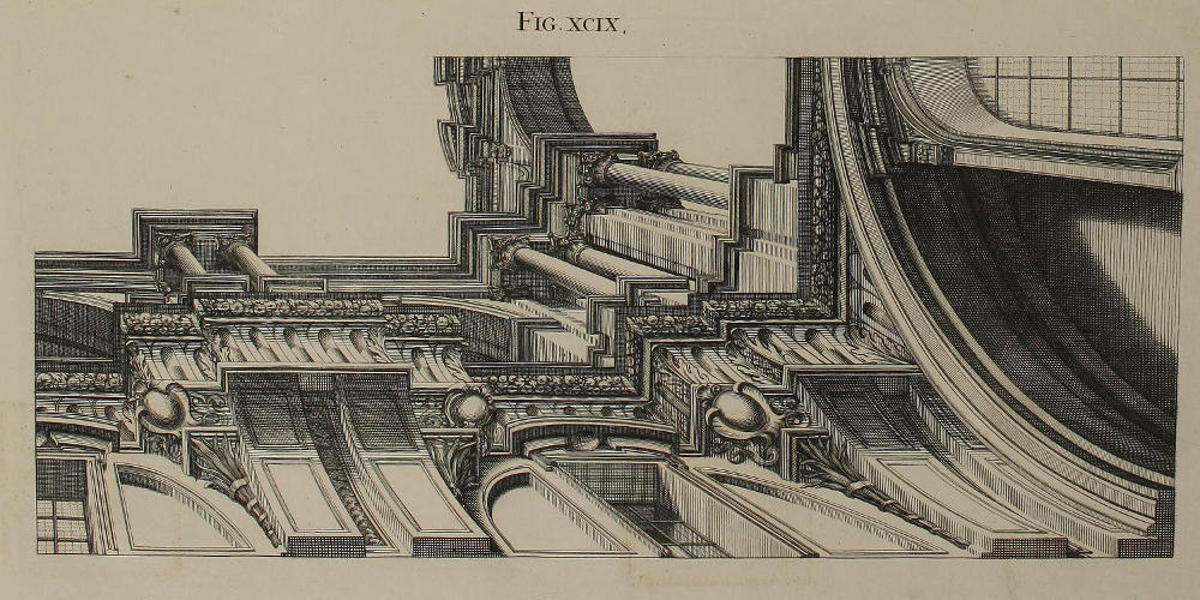 Quadrans Architecturæ horizontalis in fornice, cum luminibus & umbris, | XCVIII. | Fourth-part of the Architectonical Design on the Vault of S. Ignatius’s Church, with its Lights and Shades. |