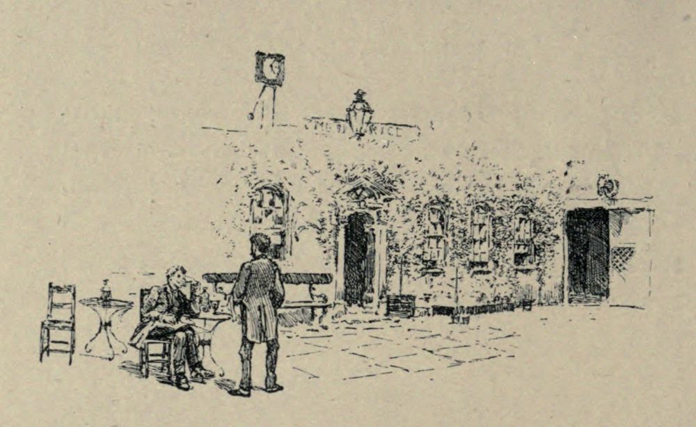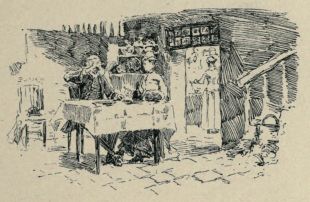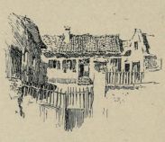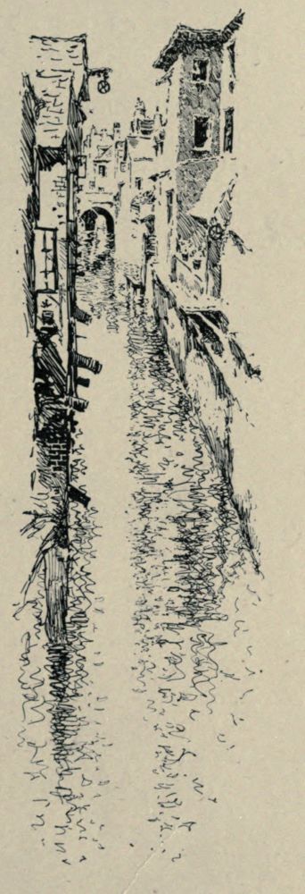 As every one who has passed in the Paris train knows, at the entrance of the town is the town-gate, a heavy grey pile, with high-gabled roof and drawbridge, the chains of which hang on either side the archway. Now that Dessein’s was gone, J—— declared that it interested him more than anything else in Calais, since Hogarth had painted it; and he began an elaborate study. It was not easy work. To the people in their holiday humour the combination of knee-breeches and sketch-book was irresistibly comic. But he went bravely on. I have rarely seen him more conscientious over a sketch. Indeed he was so pleased with this gate that later, when, at the end of a street, we came to another, under a tall[26] turreted house, and leading into a large courtyard, nothing would do but he must have that as well.—In a word, he was in a mood to draw as many gates as he could find; but by this time at the Hôtel Meurice dinner was on the table.