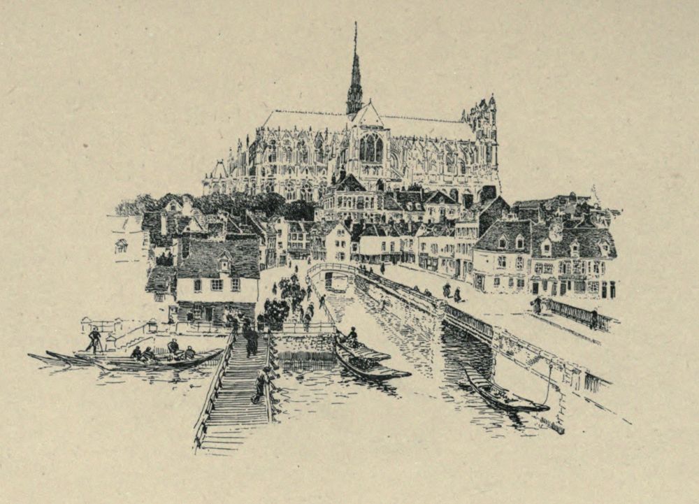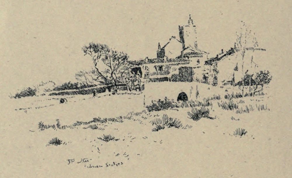 The morning was cool, the sky grey with heavy clouds, and the south wind we were soon to dread was blowing softly. It seemed a matter of course, since we were in France, that we should come out almost at once on a little river. It ran in a long line between reeds, towards a cluster of red-roofed cottages, and here and there fishermen sat, or stood, on the banks. When it forsook its straight course, the road and the street-car track from[30]