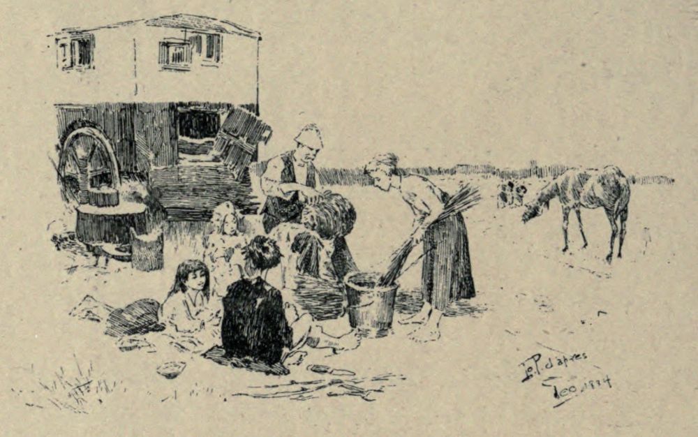 By the time we reached Pont-de-Brique the luggage-carrier hung on by one screw. Fortunately we found a carpenter in a café, and he and J——went to work.—In the meantime I saw, under the shade of a clump of trees, a green cart with windows and chimney, a horse grazing near by, and a man and woman sitting in front of a fire kindled on the grass. I walked towards the cart.——