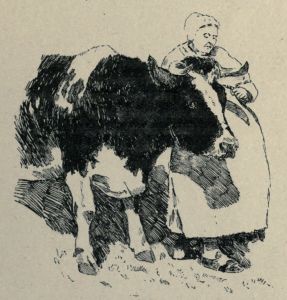 Sometimes I rode, for each tiny village nestled in a valley of its own, giving us a hill to coast as well as to climb. There were occasional windmills in the distance; and close to the road large farm-houses and barns, with high sloping red roofs and huge troughs in front, where we knew cattle would come in the twilight and horses[33] would be watered in the morning. And when Calais, with smoking chimneys, was far behind and below, we came to black crosses by the wayside and better manners among the people. The peasants now wished us good day.