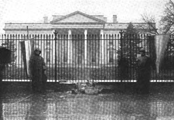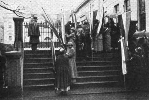 465It was not easy at an instant’s notice to find women who had the time to picket. But always there were some women willing to picket part of the time and some willing to picket all of the time. Mary Gertrude Fendall was in charge of this work. That her office was no sinecure is evident from the fact that on one occasion alone—that memorable demonstration of March 4, 1917—she provided a line of nearly a thousand. Of course, too, as fast as the women went to jail, other women had to be found to fill their places. In those days Miss Fendall lived at the telephone and between telephone calls, she wrote letters which invited sympathizers to come from distant States to join the banner-bearing forces. Those women who could always be depended on for picketing were, in the main, Party sympathizers living in Washington; Party workers permanently established at Headquarters; organizers come back suddenly from their regular work. But volunteers came too—volunteers from the District of Columbia and from all parts of the United States. In the winter, as has been before stated, picketing was a cold business. The women found that they had to wear a surprising amount of clothes—sweaters and coats, great-coats, mufflers, arctics and big woolly gloves. Many of the pickets left these extra things at Headquarters and the scramble to disengage rights and lefts of the gloves and arctics was one of the amusing details of the operation of the picket line. Banners took up space too; but they added their cheering color to the picture.