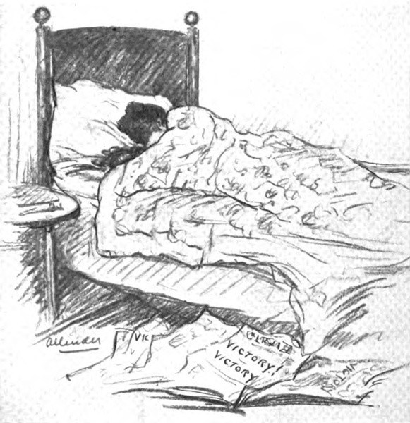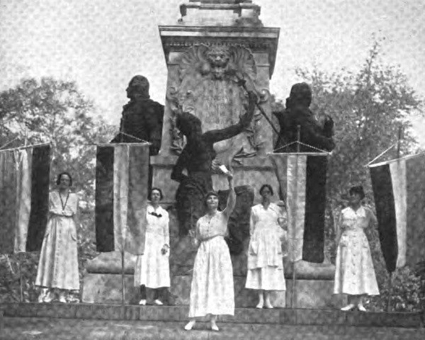 At three o’clock one morning, Julia Emory and Hazel Hunkins, two of the youngest and tiniest pickets, bore over to the Park from Headquarters several baskets of wood which they concealed in the shadows under the trees. The next problem was to get a ladder there without being seen. They accomplished this in some way, dragging it over the ground, slow foot after slow foot, and placed it against the urn. At intervals the policeman on the beat, 471who was making the entire round—or square—of the Park, passed. While one girl mounted the rudder and filled the urn with oil-soaked paper, oil-soaked wood, and liberal libations of oil, the other remained on guard. When the guard gave the word that the policeman was near, the two girls threw themselves face downward on the frozen grass. It is a very large urn and by this stealthy process it took hours to fill it. It was two days before they started the fire. Anybody might have seen the logs protruding from the top of the urn during those two days, but nobody did.