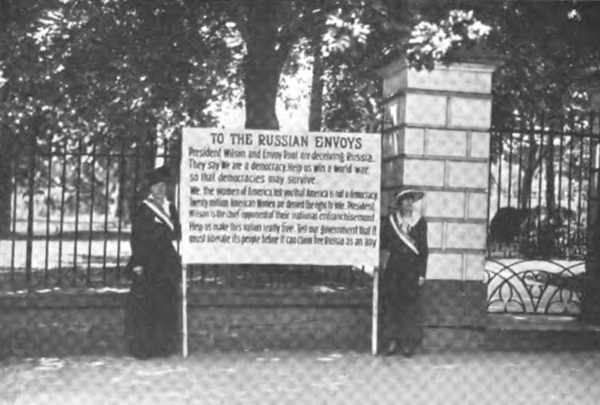 Mrs. Gilson Gardner tells an amusing story of her first arrest. In the midst of her picketing, an officer suddenly stepped up to her. He said politely: “It is a very beautiful day.” She concurred. They chatted. He was in the meantime looking this way and that up the Avenue. Suddenly, still very politely, he said: “I think the patrol will be along presently.” Not until then did it dawn on Mrs. Gardner that she was arrested.