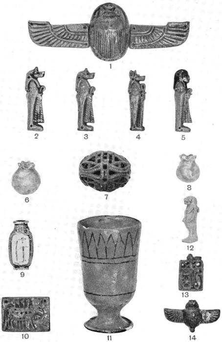 The largest scarab is of very poor workmanship. The head, which took the unusual form of a sphinx, was badly made and proportioned, and was turned slightly to one side. The workmanship of the smaller scarab was also poor. The sacred eye was well made, of a beautiful blue, and looked as if it had only just left the workshop. The monkey was one of the most startling things I have ever seen found in an excavation in Egypt. The glaze was modern and the whole thing looked as if it had recently come out of a cheap bazaar. But there can be no question about the authenticity of these things, for they were found and taken out of the graves by the archæologists of the Nubian Survey.