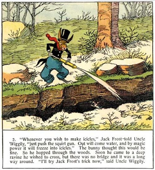 2. “Whenever you wish to make icicles,” Jack Frost told Uncle Wiggily, “just push the squirt gun. Out will come water, and by magic power it will freeze into icicles.” The bunny thought this would be fine. So he hopped through the woods. Soon he came to a deep ravine he wished to cross, but there was no bridge and it was a long way around. “I’ll try Jack Frost’s trick now,” said Uncle Wiggily.