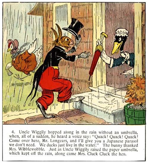 4. Uncle Wiggily hopped along in the rain without an umbrella, when, all of a sudden, he heard a voice say: “Quack! Quack! Quack! Come over here, Mr. Longears, and I’ll give you a Japanese parasol we don’t need. We ducks just live in the water.” The bunny thanked Mrs. Wibblewobble. Just as Uncle Wiggily raised the paper umbrella, which kept off the rain, along came Mrs. Cluck Cluck the hen.