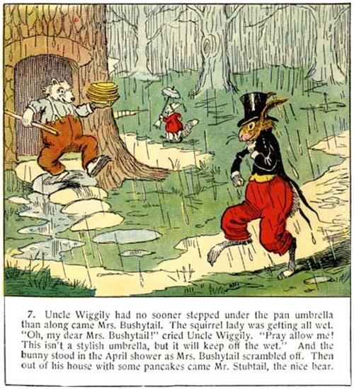 7. Uncle Wiggily had no sooner stepped under the pan umbrella than along came Mrs. Bushytail. The squirrel lady was getting all wet. “Oh, my dear Mrs. Bushytail!” cried Uncle Wiggily. “Pray allow me! This isn’t a stylish umbrella, but it will keep off the wet.” And the bunny stood in the April shower as Mrs. Bushytail scrambled off. Then out of his house with some pancakes came Mr. Stubtail, the nice bear.