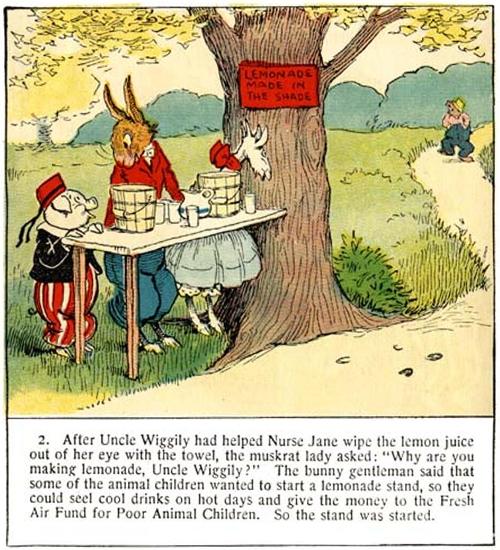 2. After Uncle Wiggily had helped Nurse Jane wipe the lemon juice out of her eye with the towel, the muskrat lady asked: “Why are you making lemonade, Uncle Wiggily?” The bunny gentleman said that some of the animal children wanted to start a lemonade stand, so they could sell cool drinks on hot days and give the money to the Fresh Air Fund for Poor Animal Children. So the stand was started.