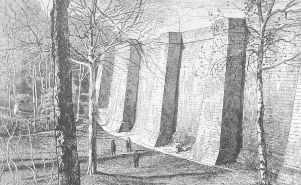 [8] 400 toises, soit 800 mètres; 30 toises, soit 60 mètres d'épaisseur et 31 mètres de hauteur selon nos mesures actuelles.