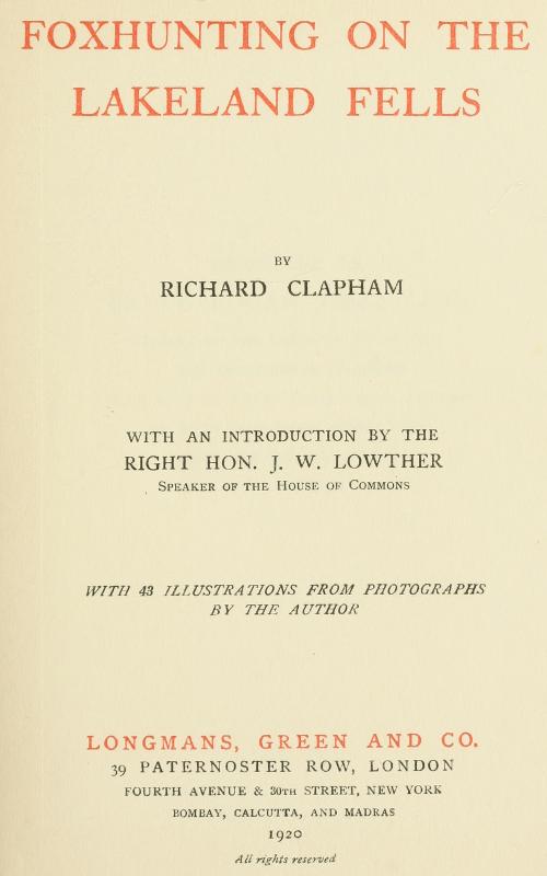 It is not my intention to attempt a record of the doings of any of the fell packs, of one of which (the Blencathra) I had the honour of being for several years the Master. I need now only express my great regret that parliamentary duties in London coincided unfortunately with the foxhunting season in the Lakes, and limited very severely my opportunities for the enjoyment of the sport, which I commend to all who are still sufficiently young in spirit or vigorous in body to enjoy this healthy pastime. Young and old alike will find in Mr. Clapham’s pages an invigorating description of the sport, as well as a record of minute and extensive observation of the habits and idiosyncrasies of the four-legged participants in the pursuit and a keen appreciation of the beauty of the surroundings in which Lakeland hunting is carried on.