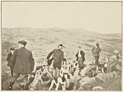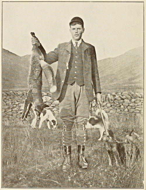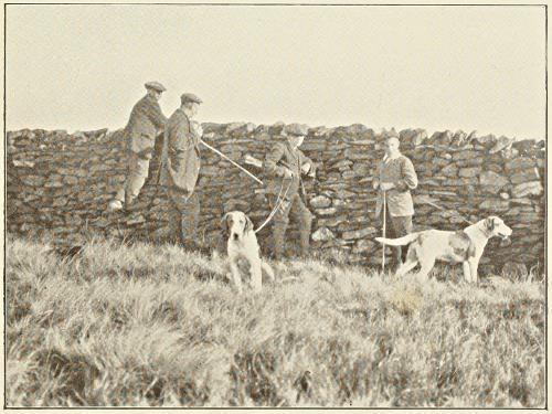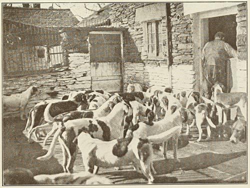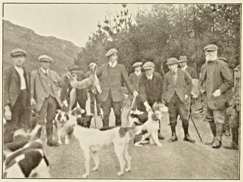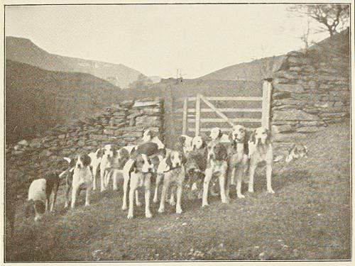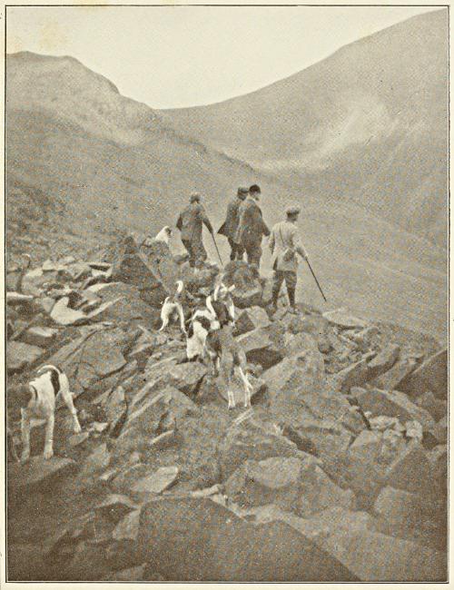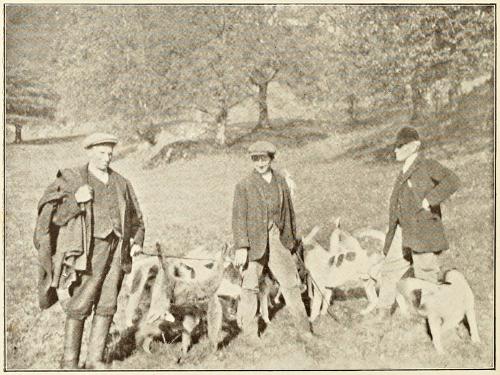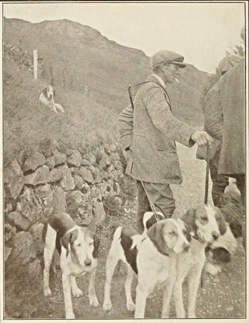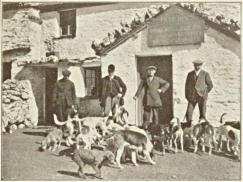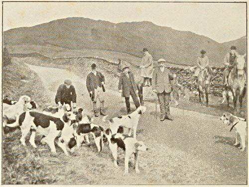 To most people “hunting” connotes horses and riders, and red coats, and breeches and boots. The Lakeland hunter, however, sees none of these things. At most he will catch an occasional glimpse of the scarlet coat of huntsman or whip. A horse would be as much out of place at a meet of a fell-side pack as a hippopotamus, and be about as useful. Breeches and boots would be an impossible handicap. The iron horse, the bicycle, takes the place of the covert hack, knickerbockers of leathers, and shooting-boots of tops.