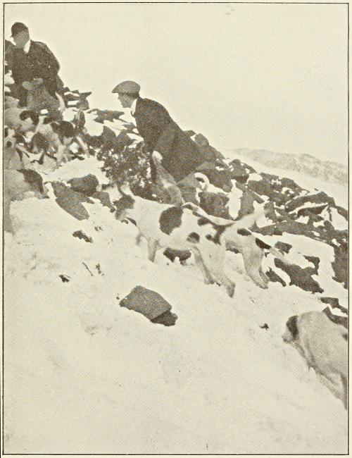 That a promising day may finish in gloom, the following experience will prove. In the last week of October, 1910, the Coniston Hounds found a fox at Pinch Crags, in Scandale. After a short but fast hunt, they rolled him over in the open. The day being still young, hounds were taken to High Pike, where a second fox was soon unkennelled. After a fast hunt this fox took refuge on the face of Dove Crag, dropping from ledge to ledge, with three hounds, Crafty, Rally and Ringwood in pursuit. Eventually the fox, in attempting to cross an impassable ghyll, owing to pressure from the young hound, Crafty, slipped and fell several hundred feet, and met its death on the rocks far below. Unfortunately, the hound shared the same fate, whilst Rally and Ringwood became hopelessly crag-fast on one of the numerous ledges. A rope and willing assistants were brought from the quarry on Red Screes, and eventually the[105] hounds were rescued from their precarious position. It was an exciting adventure, and one which, thank goodness, does not often happen.