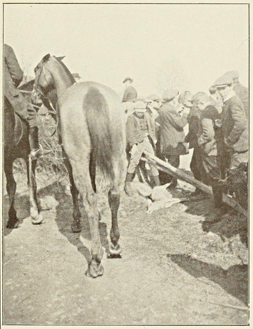 Anthony, determined to let hounds have their reward, bought the fox from its captor, and after giving it due law, the pack was laid on. Having received his money, the “not quite sharp” gentleman mounted a near-by wall and commenced to stone the huntsman for all he was worth. Anthony, to escape this fusillade, hurriedly departed in the wake of his hounds, the latter rolling their fox over in the open, after a sharp scurry.
