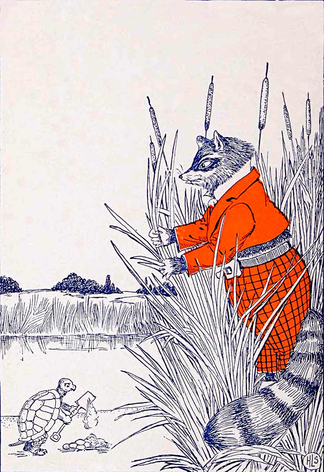 Now, Fatty was hiding behind some tall rushes, and his sharp little eyes were looking all about him, and his nose was twitching as he sniffed the air. He wished he might find a frog. But not one frog appeared. Fatty began to think that some other coon must have visited the creek just before him and caught them all. And then he forgot all about frogs.