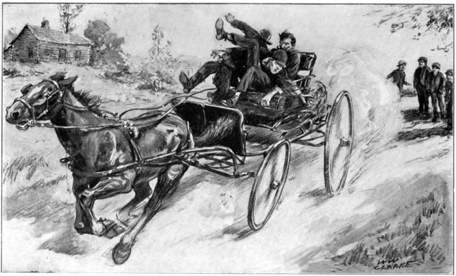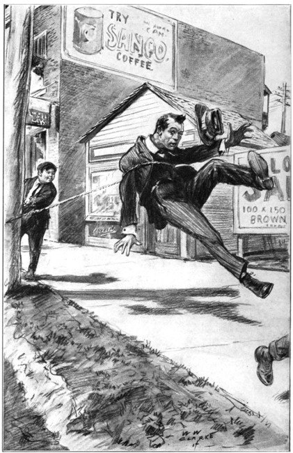 Maybe you think I didn’t get down those stairs quick. I don’t remember touching my feet at all. Seems like I made it in one leap and lit running. Collins was right at my heels, and I could almost feel his hand on my collar. I was scairt, all right, but I didn’t forget to turn the way Mark told me to. In a second I scudded past him where he stood by the telephone-pole holding his lasso. As I passed I saw him begin to twirl the noose.