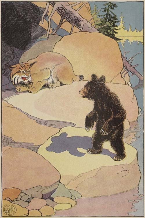It was a dreadful position for a little rolly polly bear to be in, with Loup the Lynx facing him, and his mother away in the woods where she couldn’t hear his cries. Loup was so sure of his prize that he let him squeal and cry for some time. It rather amused him.