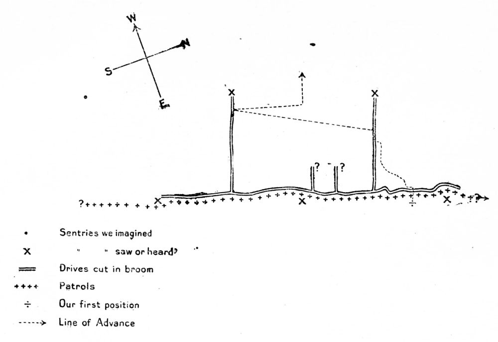We made our way through the broom, crawling one behind the other, the foremost carefully parting the bushes and holding them back for the passage of the one behind, in order that they might not whip back and cause a suspicious sound. Every ten yards or so one of us would crane his head cautiously above the broom to see if we were keeping direction relative to the drives. It was during one of these surveys that we discovered that we were on a level with the sentries on our right and left respectively; for there to our right was the other man, who was also smoking. “Blessed cigar, or whatever you are! What a splendid beacon light you show!”