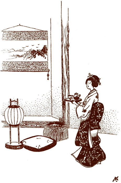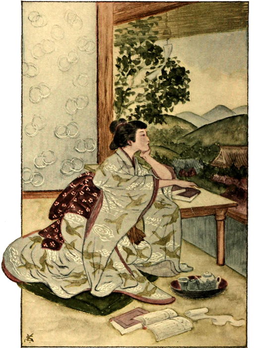 | “She did not speak to the attendant while she dined, but continued to stare before her through the open shoji” | Frontispiece |