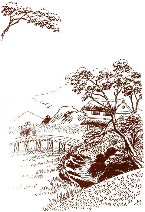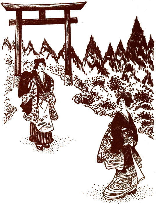 As the city was not a great distance away, they could use a comfortable kurumma which would hold them both. Four of the field coolies could be spared as kurumma carriers. In delight the foolish maid dressed her mistress, by this time all rosy with pleasurable excitement and anticipation. The adventure pleased them both, though the foolish mistress assured the foolish maid repeatedly that they would go but to the edge of the city. Thus they could see the great parade of the royal prince pass out of the city gates, for this was the day on which the prince was to leave Echizen and return to Kyoto. All his splendid retinue would accompany him. It was only once in a lifetime one was afforded the opportunity of such a sight, Ohano declared.