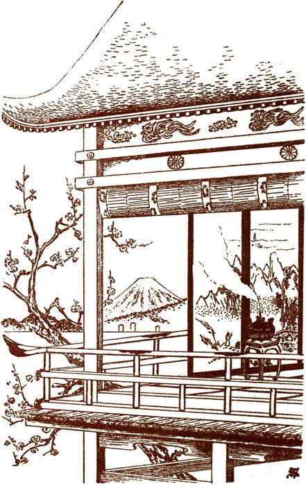 Fuji, the queenly mountain, wrapped about in its glorious garment of snow, mellowed by the touch of the sun, could be seen from her seat. On all sides of the palace grounds there were valleys and sloping hills. Within the stone walls which encircled the palace like a fortress there were gardens of wondrous beauty.