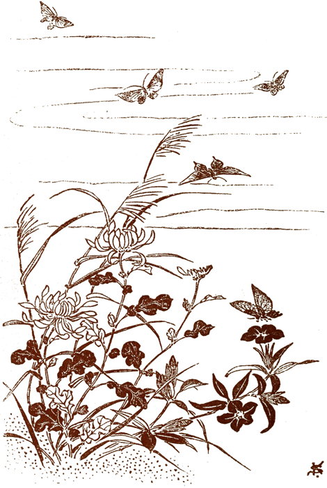 But one eventful day in the month of June, a new personage suddenly introduced himself to Sado-ko. She had been listening drowsily for a long time on the wide balcony of the palace to her grandmother’s reading aloud of ancient Chinese poems, when suddenly a swarm of her own butterflies flew by, all seemingly following the lead of a purple-hued stranger. Instantly Sado-ko left her guardian’s side in pursuit, her net swinging in her hand. She had seldom experienced any trouble in catching her own butterflies, but the stranger flew in an entirely new direction. Through a field of iris and across an orchard Sado-ko followed the flight of the butterflies, until she came to a wall, over which the purple visitor flew.