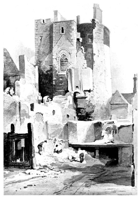 It remains to chronicle two events in the history of the great fortress in the reign of Queen Victoria. The ugly Armoury which had been begun by James II and completed by William III caught fire on October 30, 1841, from the Bowyer Tower, on which it abutted. The latter building was set ablaze by an overheated flue. The whole building was destroyed, as were 150,000 stands of small arms piled up within it. A policeman named Pierce, at the risk of his life, broke the bars of the cage in which the regalia were kept and handed them out, with the result that not one was missing, though the cloth in which some of them were wrapped was charred. The only relic of much interest which was destroyed was the wheel of Nelson’s ship Victory. The site is now occupied with the barracks, built under the direction of the Duke of Wellington, and reaching from the end of St. Peter’s Church to the East Wall, loopholed for musketry, and capable of holding a thousand men. The Iron Duke’s primary idea of the place was as a fortress.