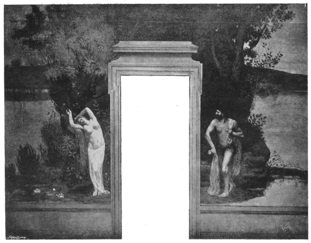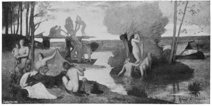 The loves of the shepherds, the follies of Olympus, Greek myths, with little logical bearing on place or object decorated, had been the subjects chosen for the walls and ceilings of public monuments and public buildings. From these uninspired conceptions to the creations of Puvis de Chavannes is a decided transition. His compositions, never fantastic or impossible, are the highest conceptions of the real, as well as visions of{15}