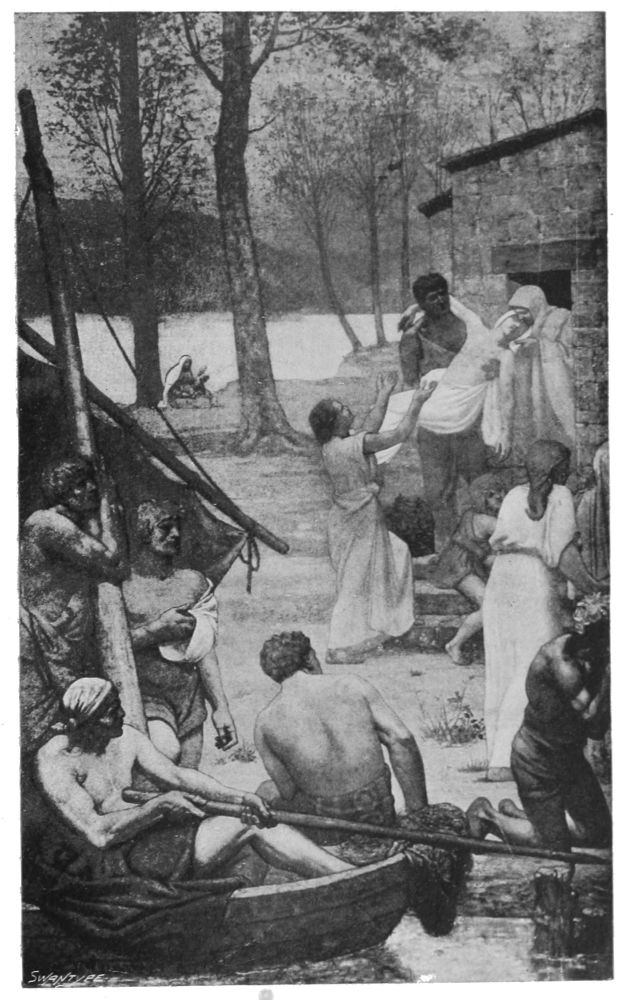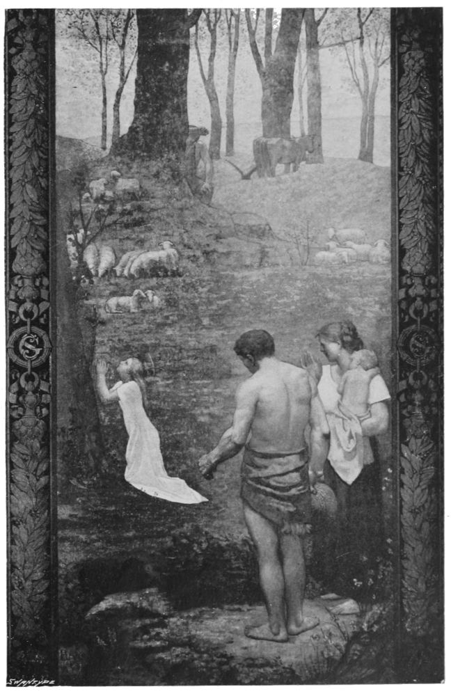 “The Childhood of Ste. Geneviève,” four panels to the glory of the patron saint of Paris, covers a portion of the right wall of the Panthéon. This was the first decoration given at the close of the war of the Commune. The subjects are the pious Childhood, the{23}