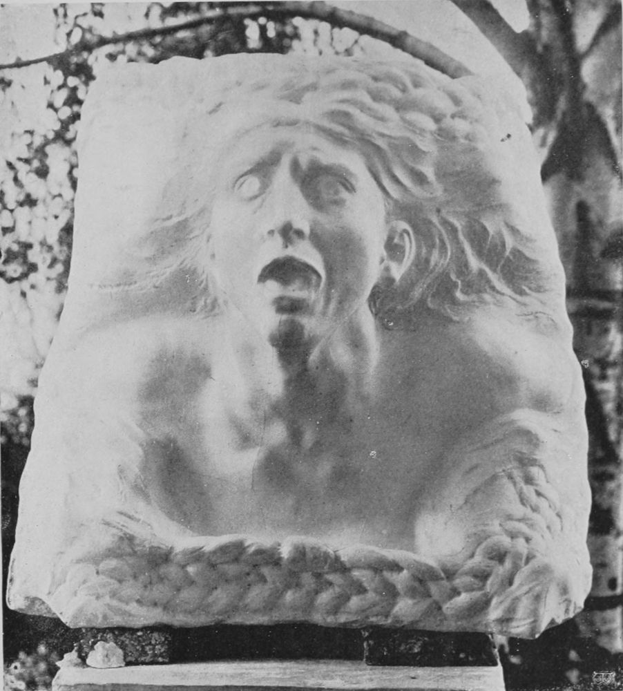In his studio in the Rue Caulaincourt, walking to and fro, he converses delightfully with his friends. He is a workman, his muscular hands are full of force, his build powerful, although he is compact and small. He suggests endurance, and the patience that is the result of hand-to-hand tussle with existence, and tender understanding of the needs of one’s neighbour. His eyes are keen, penetrating, and kind, his features strong. He has a golden voice, as the French say, caressing and indolent. Its measured cadence, its slow, agreeable flow contrasts strongly with the man himself. He wears the coarse velveteens of the labourer, cuffs close around his muscular wrists. His trousers are voluminous, and on his feet flap loose Indian slippers. His appearance, and the fact that his studio is in one of the poorest quarters of Paris, his whole attitude and life, suggest, not a{189}