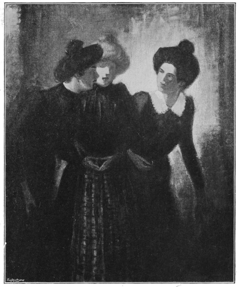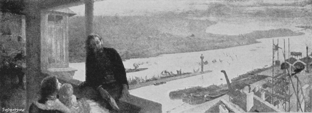 Possibly Steinlen is nowhere better displayed than in a certain canvas at present in his studio in the Rue Caulaincourt. It is a life-size oil painting, a study of a man and woman in the working class. It is evidently the end of the day, and the scene a nook or corner in some room so distant from the rooms we all know that it is hard even to imagine where it may be. The workman has taken the young creature in his arms for a long embrace. His head is bent over her, and she looks out from the picture above the man’s arm. Her face is exquisite, and in thorough keeping with the type of her class.