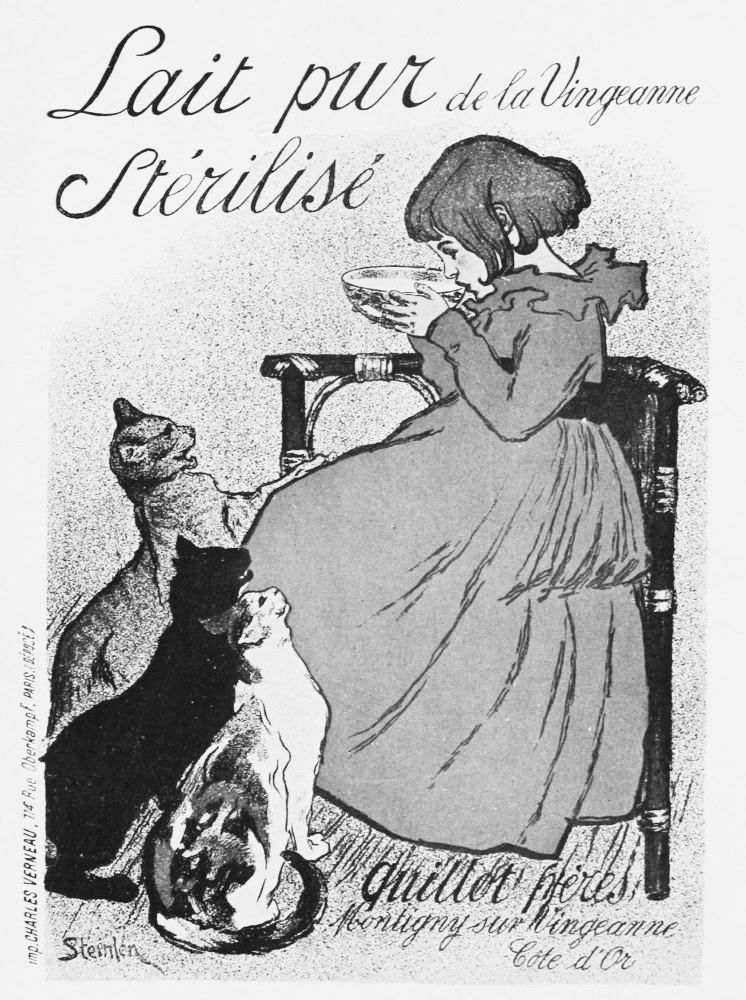a table drinking a bowl of milk, under the jealous eyes of three great cats. The child is Steinlen’s little daughter, and the drawing of child and cats is as skilful and clever as it well can be.