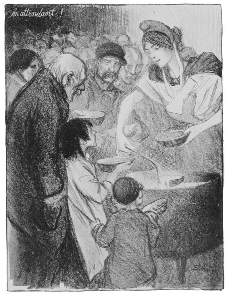 For the most part the illustrations in Gil Blas are coloured. They are satires on life drawn to accompany some “Saut d’esprit” or to portray simply street scenes{168} as Steinlen knows them, or are political cartoons. In his street studies he has been relentless in his realism, careless of how unpleasant may be the impression of these frankly told horrors. No detail of sordid existence has been neglected in his bold depicting of the city’s misery.
