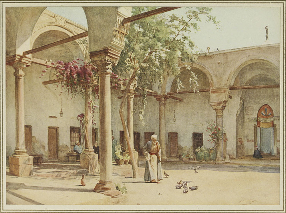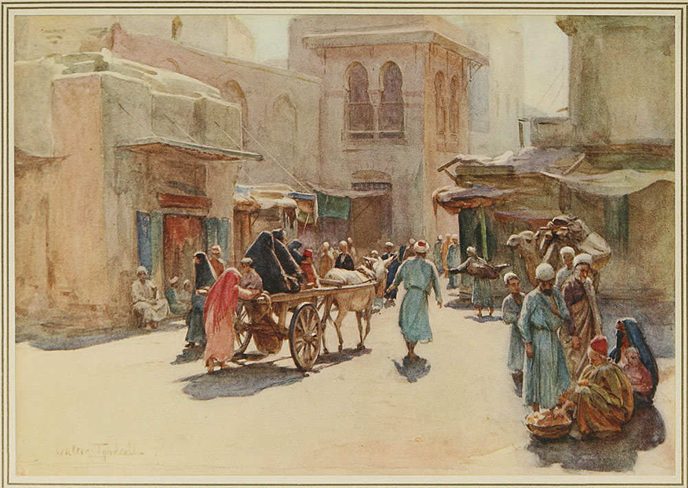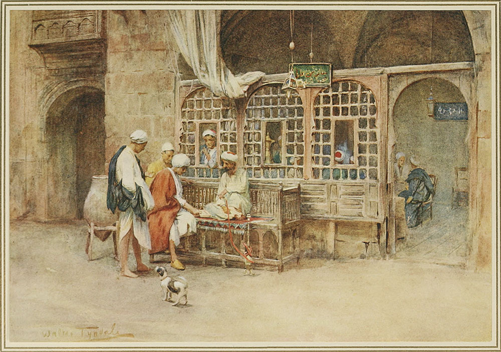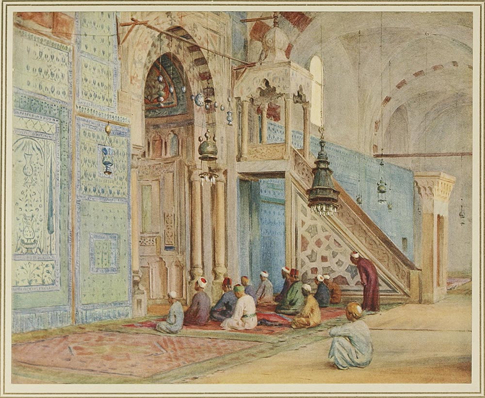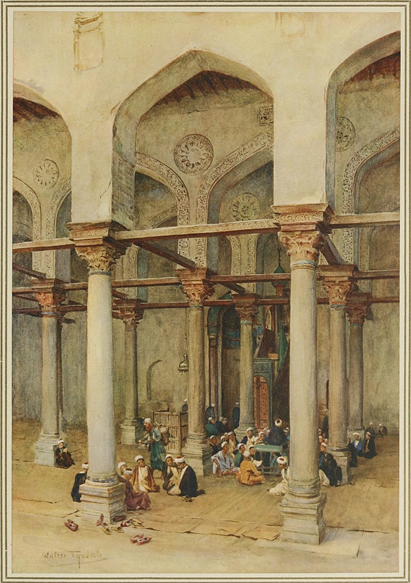 I returned to the mosque to start my drawing, and remained there until it was time to join our tea-party at the camp. Two or three men dropped in during the midday prayer, but the caretaker beckoned to me not to move my easel. Some boys arrived later on and sat around an old sheykh who expounded the Koran to them.