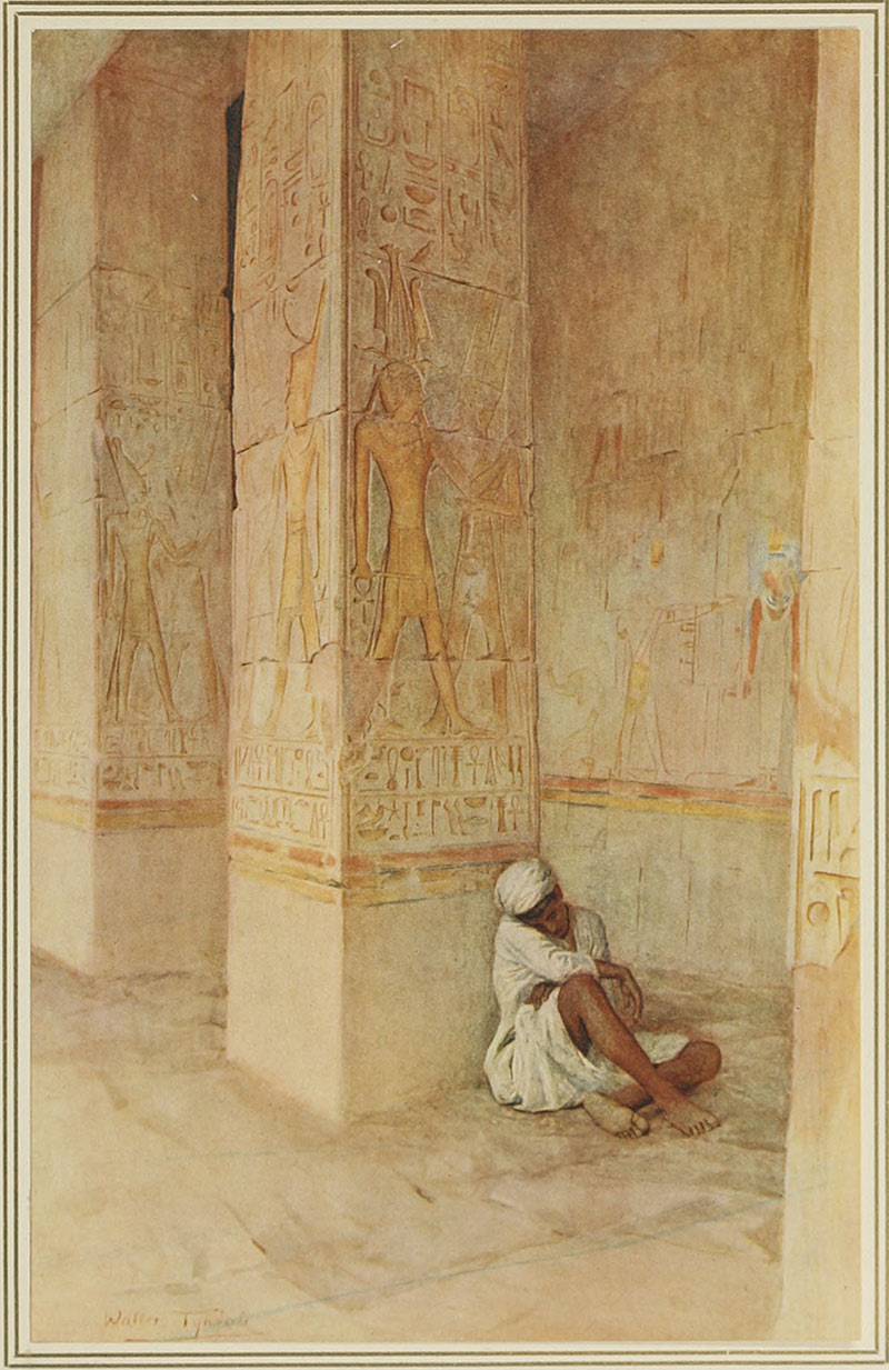 Towards the end of my season at Der el-Bahri, which as usual was two months after the hotels at Luxor had put up the shutters, Mr. Weigall suggested my spending June with him in the tombs and temples south of Thebes. The valley in which I camped had become a veritable oven, and my hut was untenable till the sun sank behind the cliffs which form the amphitheatre behind Hatshepsu’s shrine. Some work I wished to do in the temple of Edfu, as well as to get shelter from the burning sun, tempted me to accept this kind invitation. The quarries and shrines at Gebel Silsileh, the tombs of Assuan and the courts and colonnades at Philae, all held out hopes of shady places in which I should find plenty of subjects to paint.
