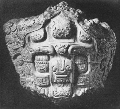 Top face of the monolith known as the "Dragon" or the "Great Turtle" of Quirigua. This is one of the group of stelae and "altars" which mark the ceremonial courts of this vanished Maya city (see Plate XXIII); and is perhaps the master-work not only of Mayan, but of aboriginal American art. The top of the stone here figured shows a highly conventionalized daemon or dragon mask, surrounded by a complication of ornament. The north and south (here lower and upper) faces of the monument contain representations of divinities; on the south face is a mask of the "god with the ornamented nose" (possibly Ahpuch, the death god), and on the north, seated within the open mouth of the Dragon, the teeth of whose upper jaw appear on the top face of the monument, is carved a serene, Buddha-like divinity shown in Plate XXV. The Maya date corresponding, probably, to 525 a. d. appears in a glyphic inscription on the shoulder of the Dragon. The monument is fully described by W. H. Holmes, Art and Archaeology, Vol. IV, No. 6.