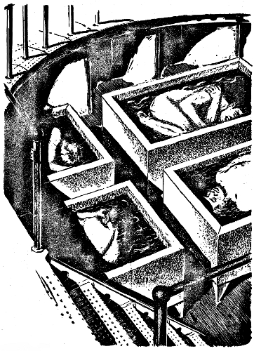 He found the locker which bore his name, and opened it. Six other lockers were open and empty, as were six tubs. He found that hard to believe. It had seemed only a night of deep and dreamless sleep, no more. But each empty tub stood for twenty-five years, each open locker meant a man had gone and lived his time with the new generations of the ship, perhaps had sired children, had died with old age.